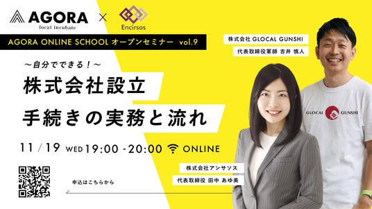 株式会社AGORAでは、2025年11月19日(水)に「株式会社設立」をテーマにした創業WEBセミナーを開催します。