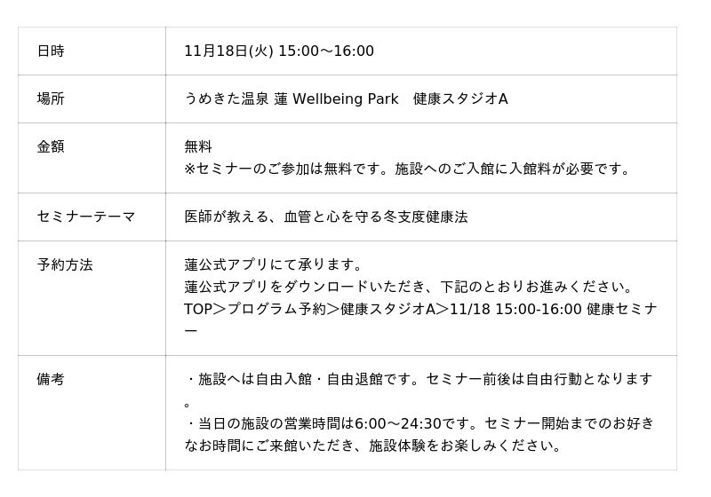 「うめきた温泉 蓮 Wellbeing Park」(総支配人:藤立 達哉、所在地:大阪市)は、「Doctor’s Fitness」(院長:宮脇 大、所在地:大阪市)と連携し、第2回健康セミナー開催をお知らせいたします。