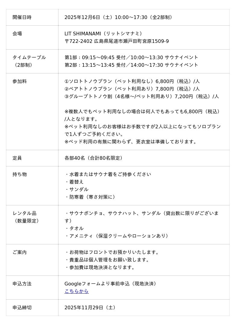 2025年12月6日(土)、瀬戸内・生口島のグランピング施設「LIT SHIMANAMI」にて、2025年の夏に初開催で大盛況だった「しまなみサウナフェス2025」がさらにパワーアップして再び開催!今回も、全国の個性豊かな人気熱波師が集結し、本格アウフグースなどを披露。そして、新たに美容体験やサウナ後の時間をさらに充実させる焚き火B A R、たこ焼きキッチンカーの来場もあり、心と身体、全身がととのうサウナ体験をお届けします。地域発・尾道×瀬戸内×サウナの新たなサウナカルチャーを楽しんでみませんか?