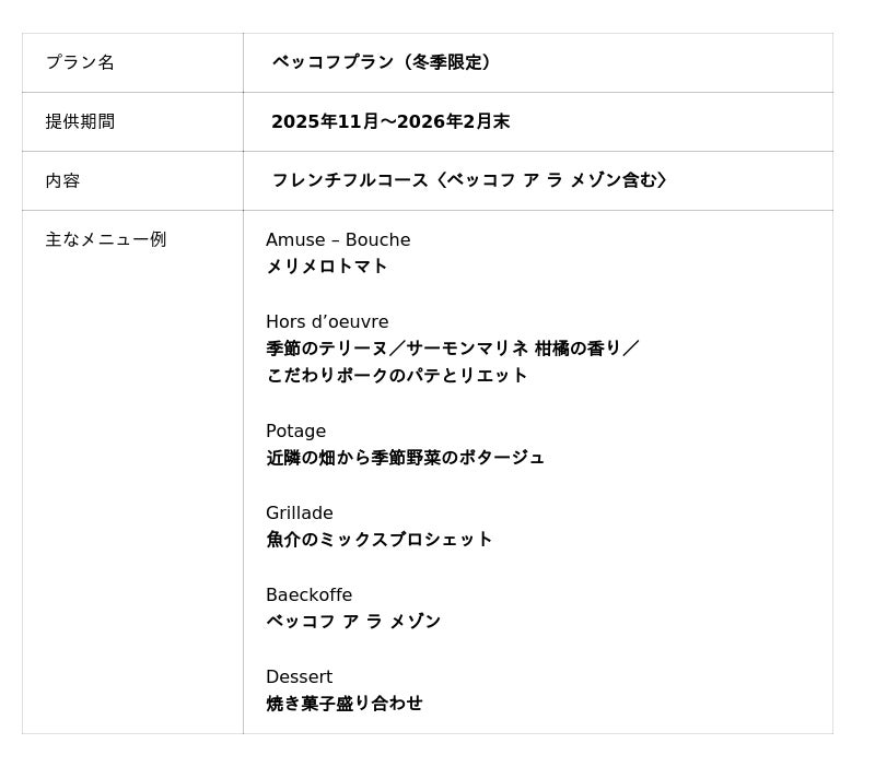 寒い季節だけに提供される冬限定ベッコフプラン。身体の芯から温まる煮込み料理は、この時期ならではのごちそう。
