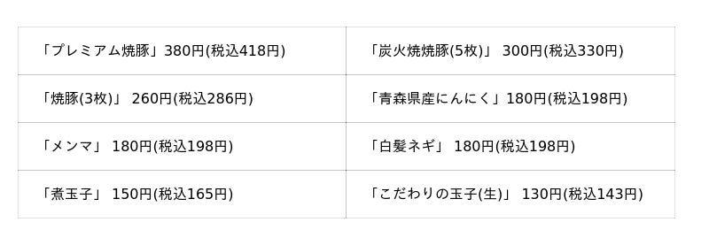極王餃子の王将ラーメンにも使用している「プレミアム焼豚」を始め、「青森県産にんにく」、「こだわりの玉子(生)」などのトッピングメニュー8品も、11月13日よりお選びいただけるようになりました。