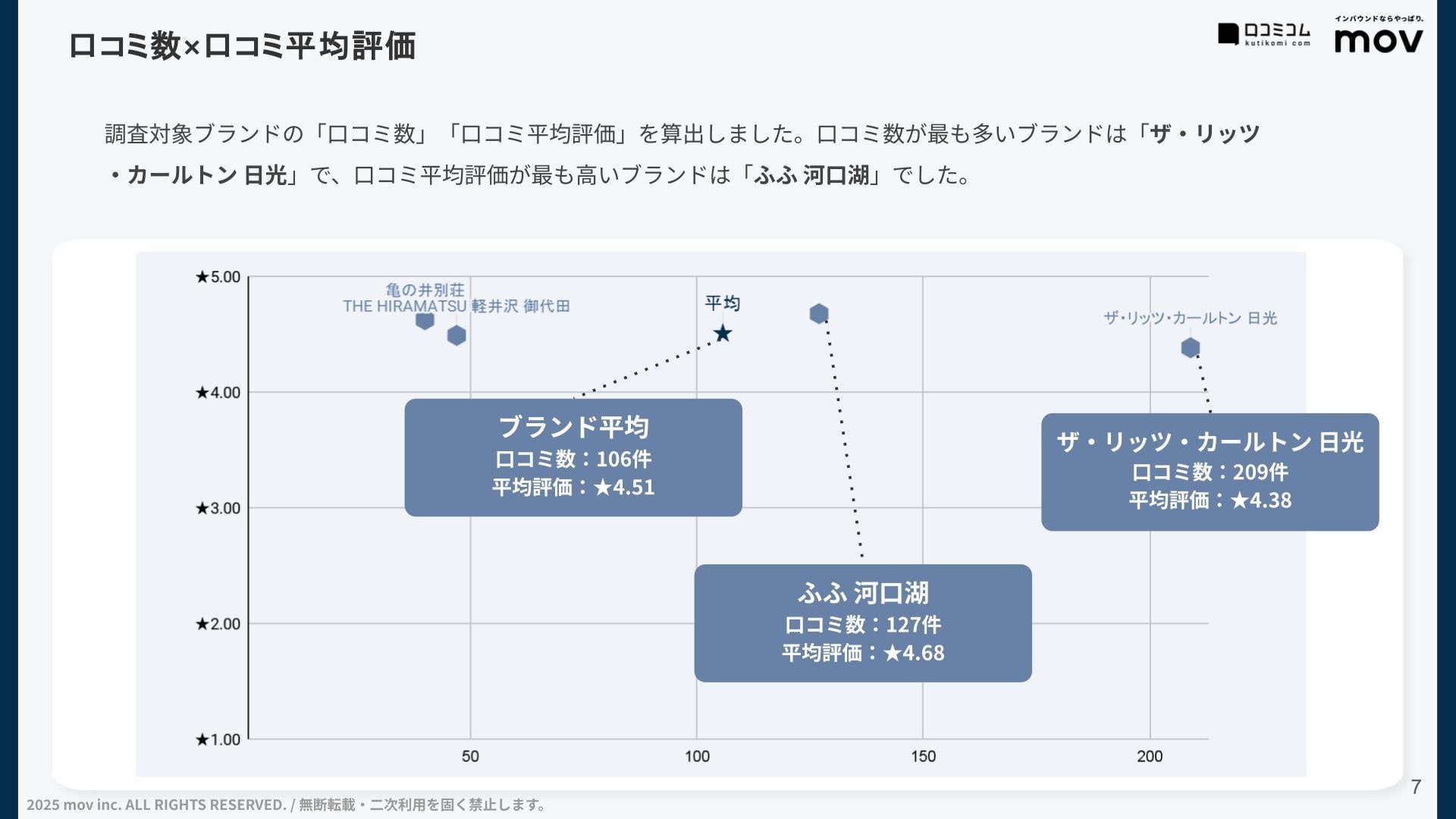 調査対象ブランドの「口コミ数」「口コミ平均評価」を算出しました。口コミ数が最も多いブランドは「ザ・リッツ・カールトン 日光」で、口コミ平均評価が最も高いブランドは「ふふ 河口湖」でした。