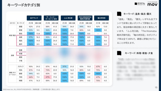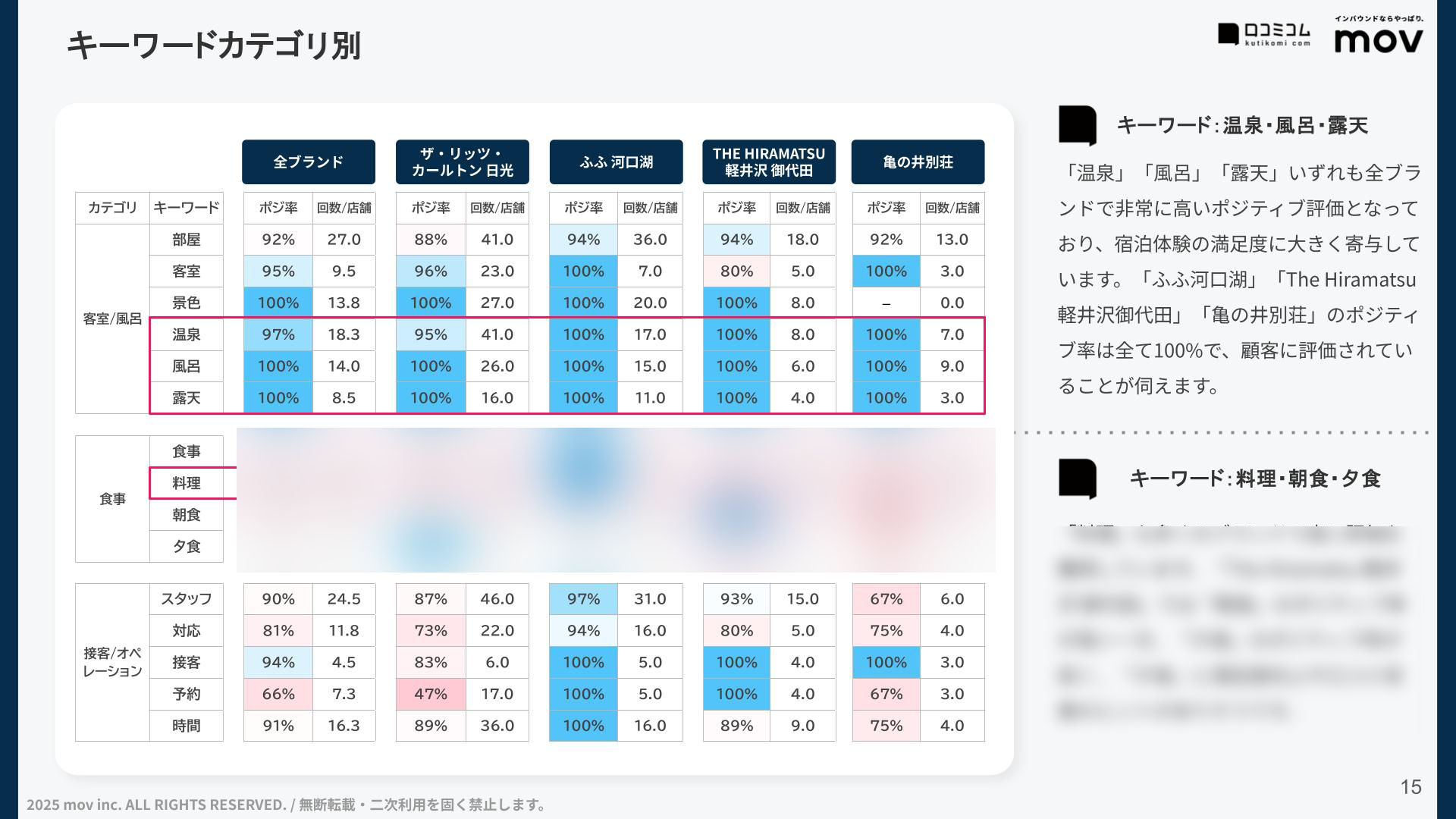 「温泉」「風呂」「露天」いずれも全ブランドで非常に高いポジティブ評価となっており、宿泊体験の満足度に大きく寄与しています。「ふふ河口湖」「The Hiramatsu軽井沢御代田」「亀の井別荘」のポジティブ率は全て100%で、顧客に評価されていることが伺えます。