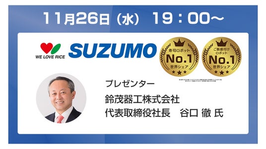 鈴茂器工は1981年、世界初の寿司ロボットを開発し、以来、米飯加工ロボットのリーディングカンパニーとして業界を牽引しています。世界90か国以上の寿司、おむすび、丼ものなど、様々な食のシーンで幅広く利用されています。寿司ロボットとご飯盛付けロボットにおいては、シェアNo.1を獲得(出典:富士経済「2025年版 ワールドワイドロボット関連市場の現状と将来展望 サービスロボット編」寿司ロボット・米飯盛り付けロボット 販売数量・金額2024年実績)。第20回外食アワード2023(主催:外食産業記者会)を受賞するなど、業界でも注目を集めております。