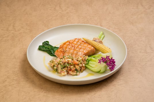 マリネしたサーモンのステーキ グリビッシュソースのタルタル 2,680円脂の乗ったサーモンをグリルし、余分な脂を落としつつ美味しさを保ちました。食べる野菜のタルタルでさっぱりと!