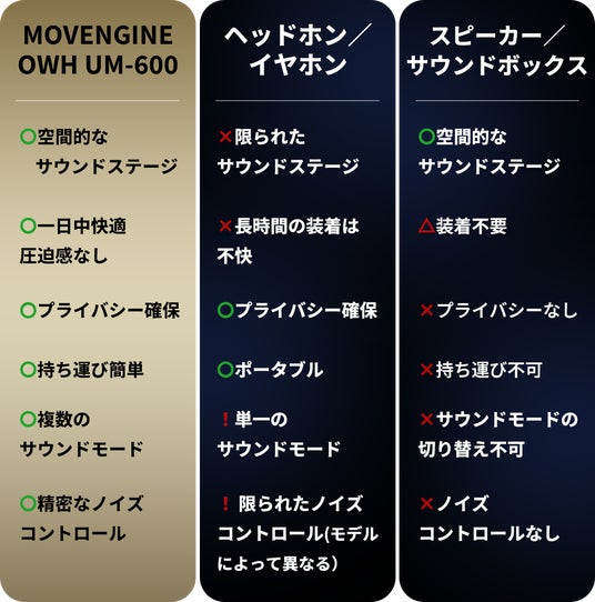 自然な開放感と遮音性、どちらを選ぶか迷う必要はありません。Movengine AirCore(TM) OWH「UM-600」なら、環境に応じて「オープンモード」と「シールドモード」を切り替えることができます。