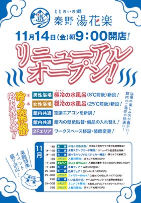 株式会社レンブラントホテルズアンドリゾーツ(所在地:神奈川県厚木市)が運営する温浴施設「ととのいの郷 秦野湯花楽」(所在地:神奈川県秦野市)は2025年11月4日から13日までの改装工事期間を経て、2025年11月14日(金)にリニューアルオープンいたします。