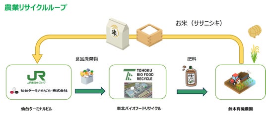 仙台ターミナルビルが運営する施設から発生する食品廃棄物は、東北バイオにてリサイクルされ、電気や肥料となって利活用されています。生産された肥料の一部は、地元農業生産者の「鈴木有機農園」にてお米(品種:ササニシキ)の栽培に活用され、収穫されたお米は、仙台ターミナルビルが運営する商業施設「エスパル仙台」内の飲食店「すし哲」で提供されています。これにより、地域で発生した廃棄物を地域内で再資源化し、さらに地域で利活用する、地産地消型の「農業リサイクルループ」が実現しています。