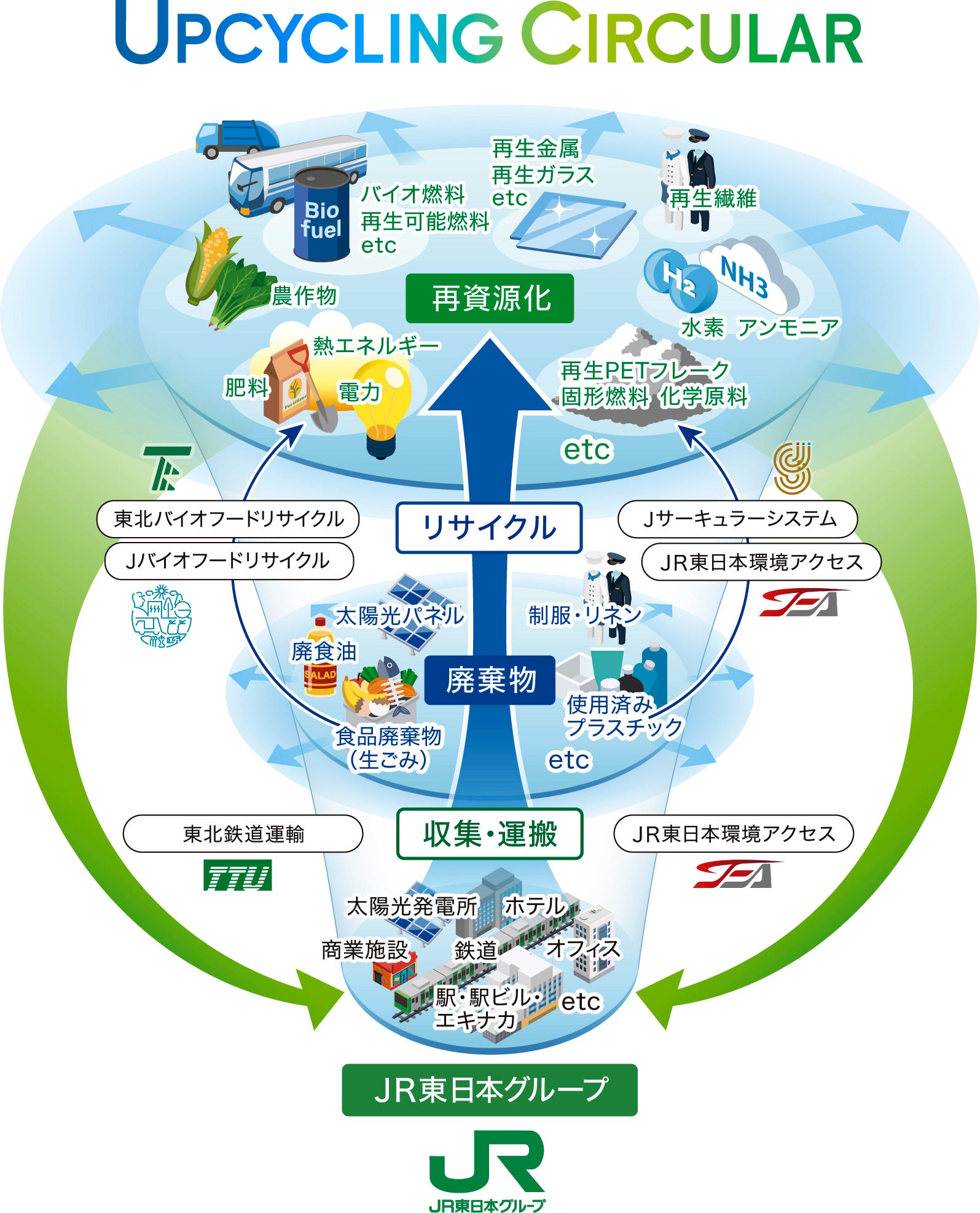 JR東日本グループではグループの事業活動から発生する廃棄物を、グループ会社などと協業し、回収、収集・運搬、リサイクルし、これを新技術・外部連携を活用しながら再資源化、グループ内にて利活用することで、持続可能なサーキュラーエコノミーをさらに推進していきます。