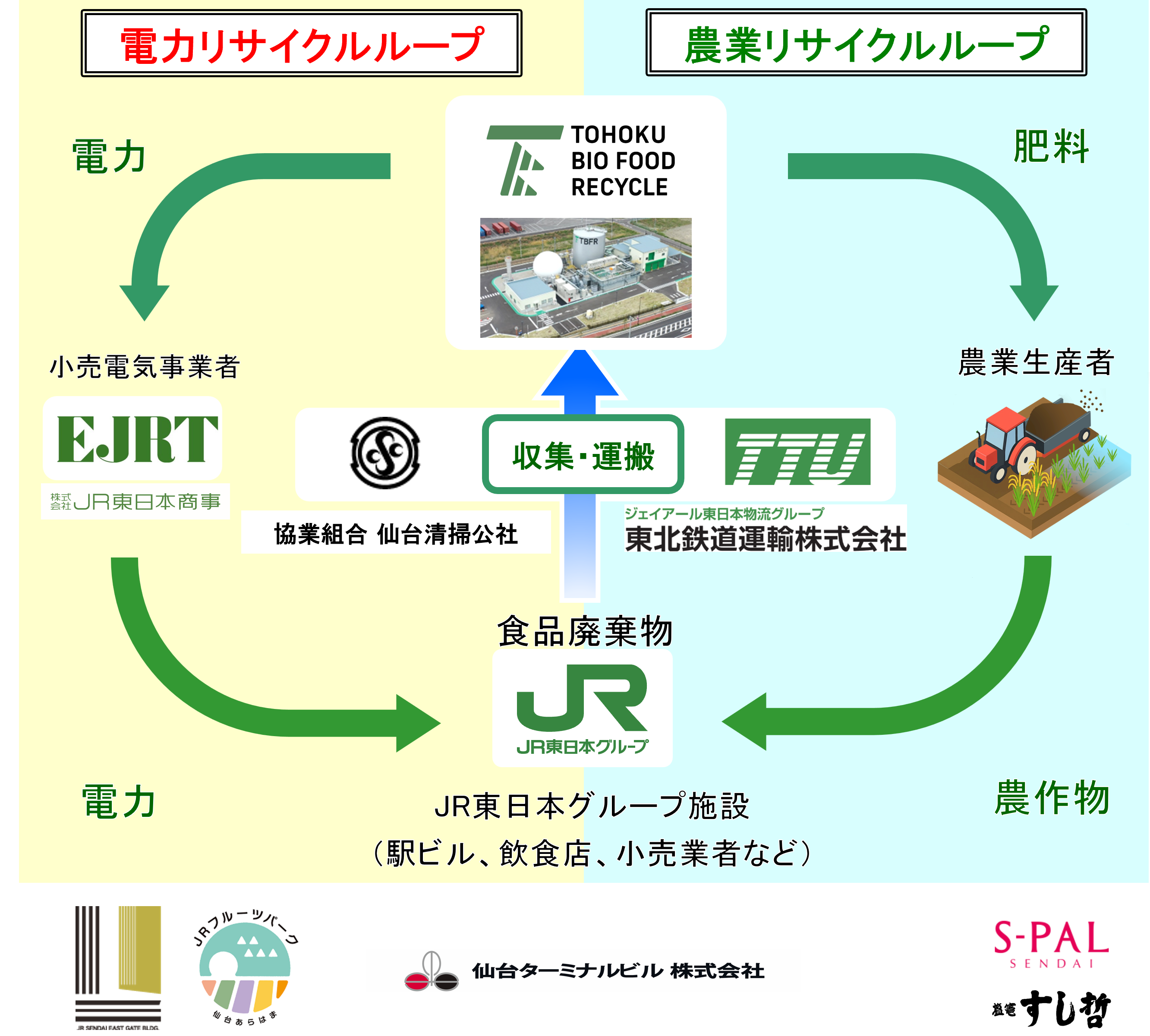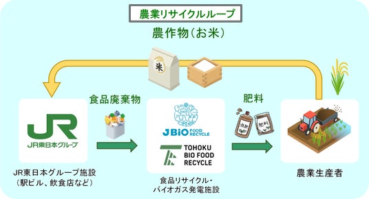 このたび、首都圏・仙台エリアにおいて、Jバイオおよび東北バイオが食品廃棄物から生産した肥料を活用して栽培されたお米を、グループ施設の飲食店で食材として提供する「農業リサイクルループ」が実現します。この取り組みは、Jバイオおよび東北バイオとお米の生産者との連携、JR東日本グループ会社および関連会社の協力により可能となり、JR東日本グループにおける「農業リサイクルループ」の取り組みが拡大します。