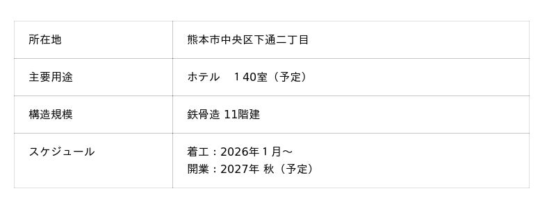 株式会社三交イン(代表取締役社長:長井康明 本社:名古屋市中村区)は、事業展開しているビジネスホテル「三交イン」の九州1号店として、熊本市中央区下通二丁目に、株式会社えがお(代表取締役会長兼社長:北野忠男 本社:熊本市東区)のグループ会社から建物を賃借し、「(仮称)三交インGrande熊本」(2027年秋開業予定)を出店することをお知らせいたします。