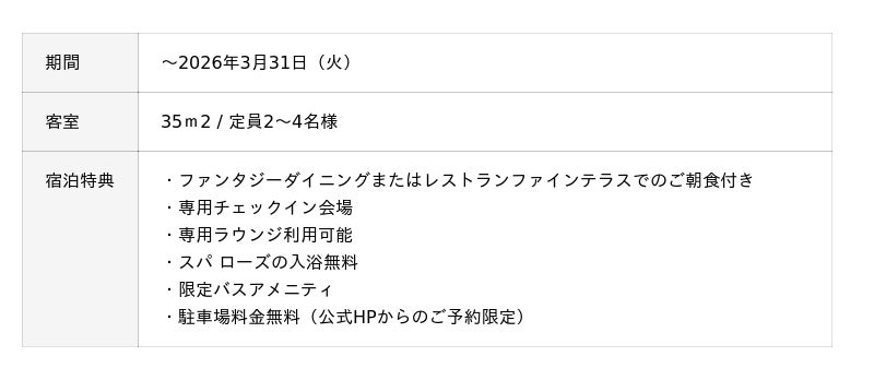 こちらのプランでは、ソファに座ってゆったりとチェックインの手続きができる「専用チェックイン会場」やドリンクやスナックが楽しめる「専用ラウンジ」、スパでのご入浴が無料、限定バスアメニティ付きなど優雅で快適なホテルステイをお約束する特典をご用意。朝食は、「ファンタジーダイニング」または「レストラン ファインテラス」の2会場からお選びいただけます。「ファンタジーダイニング」での朝食は、専用宿泊プランをご予約のお客様のみが対象のため、ゆったりとした贅沢な時間をお過ごしいただけます。