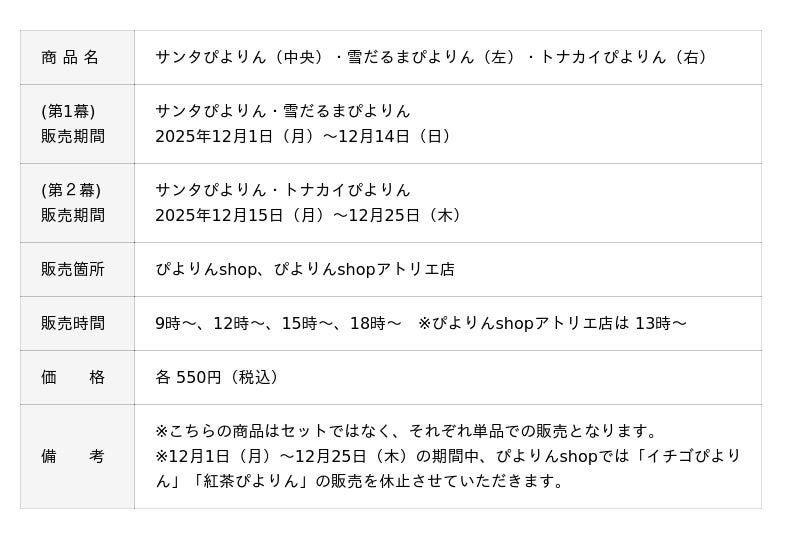 ジェイアール東海フードサービス株式会社(本社:愛知県名古屋市、代表取締役社長:岩下賢一)は、人気スイーツ「ぴよりん」のクリスマス限定商品を、2025年12月1日(月)から25日(木)まで販売いたします。今年は1度じゃ終わらない2部構成!第1幕は「サンタ&雪だるま」、第2幕は「サンタ&トナカイ」ぴよりんと、3種類のクリスマスぴよりんが入れ替わりで登場します。