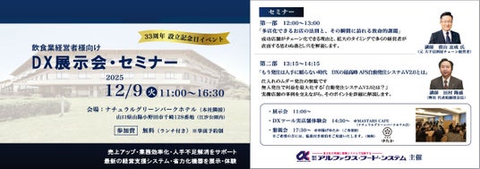 株式会社アルファクス・フード・システムは、2025年12月9日にAFS 33周年設立記念日イベントとして“飲食店経営者向け”DX展示会・セミナー・懇親会を開催いたします。本セミナーは二部構成となっており、第一部では、経営コンサルタントとして多くの経営者から定評のあるグッドアロウ総研 代表コンサルタント 窪山忠成氏をお迎えして成功店舗がチェーン化できる理由と、拡大のタイミングで多くの経営者が直面する思わぬ落とし穴について解説いたします。第二部では、当社代表取締役会長 田村隆盛より “仕入れのムダ=発注の無駄” 無人発注で利益を最大化する「自動発注システムV2.0」について実働店舗の事例を交えながら、そのポイントを詳細に解説いたします。
