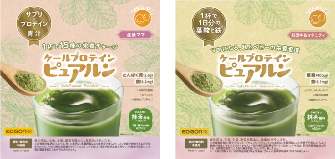 そこでエジソンママは、ブランドとして初めて、「ママ自身のための食品」に挑戦しています。子育ての現場で寄り添い続けてきた視点をそのままに、育児を続ける体と心を支える商品として開発したのが 「ケールプロテイン ピュアルン」 です。国産ケール100%と植物由来プロテインを組み合わせ、妊娠期から産後・育児期まで不足しがちな15種の栄養素を、1日1杯でしっかりサポート。香料・着色料不使用で、毎日飲みやすいやさしい抹茶風味に仕上げました。