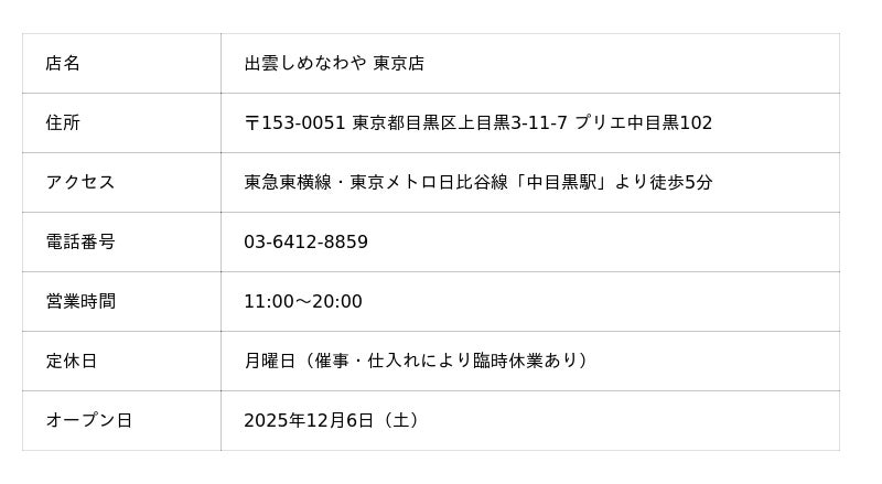 中浦食品株式会社(本社:島根県松江市、代表取締役社長:鷦鷯 侑)は、山陰地方の魅力を発信する新拠点として、東京・中目黒にアンテナショップ「出雲しめなわや 東京店」を2025年12月6日(土)にグランドオープンします。店内正面には出雲大社神楽殿の“大しめ縄”を手がける「飯南町大しめなわ館」による本格しめ縄を設置。出雲そば、宍道湖産しじみ、地酒や和菓子など、島根・鳥取の特産品と“物語”を取り揃え、関東初のブランド拠点として展開します。