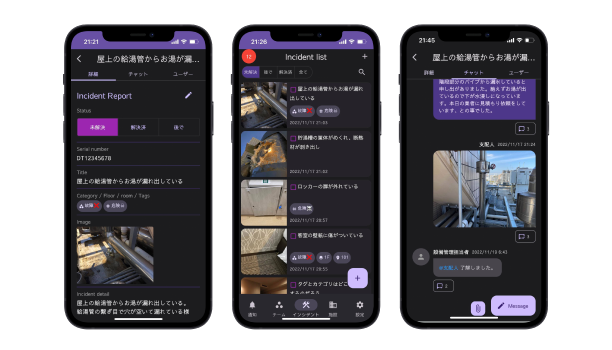 現場と管理者をリアルタイムに繋ぐHoteKanでは、清掃スタッフが清掃時に客室の設備の不備に気付いた際に、スマホで写真を撮影し状態を入力します。ホテルスタッフや工務店がアプリで確認し、その後の対応について、その事象内チャットでコミュニケーションします。見積書や修繕解決後の写真もアップして、完了。修繕記録や報告書がデジタルに残ります。同じような事象が起きた際も事象や部屋番号ごとに検索が簡単にできます。消防機器点検やEV点検などの法定点検の定期メンテナンスの報告書も整理できるため、ペーパーレスも促進します。