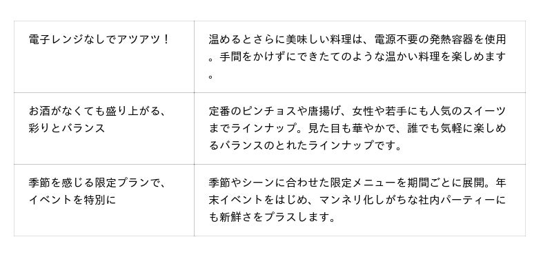 これらのイベントの企画・運営、料理や会場の手配など、幹事にとって時間と労力がかかる作業が多く、負担も増加します。「EAZY CATERING」を利用すれば、料理の準備や後片付けの手間も軽減。忙しい年末でも、社員への労いやチームビルディングの場として、気軽に“少し特別なひととき”を楽しめます。