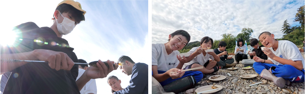 網を投げる体験に続いて、鮎の塩焼きに挑戦しました。アユが泳いでいる形のように、くの字やS字型に曲げて串を刺します。児童らは、真剣な表情で命と向き合い、それぞれに串打ちを行いました。焼きあがったアユは、皮はパリッと香ばしく、身はふっくらジューシー。こんなに美味しいアユが、自分たちの学校の近くの川に棲んでいるということを知り、地域の魅力を再発見するとともに、川や海の恵み、豊かさを体感しました。