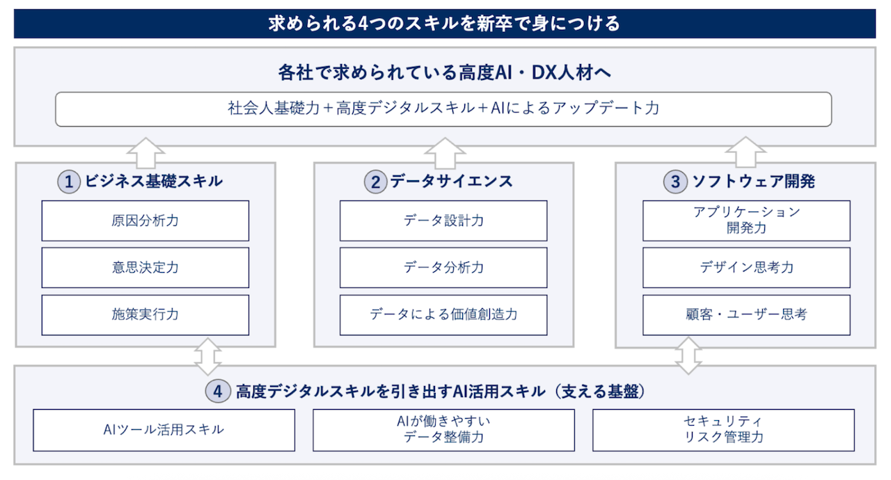 新人を高度AI・DX人材へと育成するために必要なスキルを4つの領域で定義しています。育成したい人材像に合わせてカリキュラムを組み合わせ、各社に最適な研修を設計します。