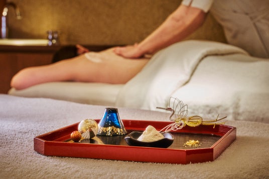 トリートメントは、酒粕の成分を配合したきめ細かくなめらかなスクラブを用いた、肩から下の全身のピーリングからスタート。発酵成分の恵みにより、肌のターンオーバーの促進や、優れた保湿効果をもたらす酒粕が、保湿しながら古い角質をやさしく取り除き、やわらかく澄んだ輝きのある肌へと整えます。また、日本酒の製造過程で生まれる酒粕は、酒米や米麹の栄養素が凝縮されており、なかでもアミノ酸やビタミンB群は血行を促し、肌を内側から温めるような心地よい温もりを感じさせます。ピーリング後さらに、柚子ジンジャーオイルを用いた丁寧なマッサージで身体を温めながら、深いリラクゼーションへと導きます。
