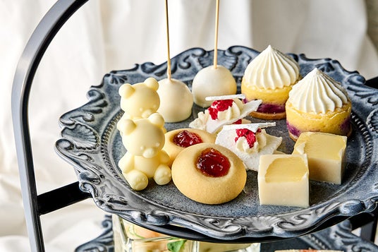食べるのがもったいないほどカワイイ白くまのホワイトチョコレートや、いちごジャムを乗せたルビーのペンダントのような見た目のしっとりとした食感のホワイトクッキー、ベリーの甘酸っぱい味わいを引き立たせたロリポップ仕立てのケーキ、カスタード風の生地に生のブルーベリーを重ね焼き上げた柔らかくしっとりとした焼き菓子などが味わえます。