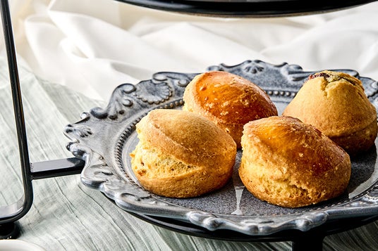 <スタンド下段>ゲランド塩スコーン / シナモンシュガースコーン /(コンディメント)ブルーベリージャム / クロテッドクリーム