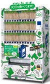 飲み物を販売するだけでなく、内部に組み込まれた特殊な吸収材によって、大気中のCO2を回収するという機能を備えた、国内唯一の自動販売機です。吸収材は、加工や輸送に伴うCO2排出量を上回るCO2吸収効果を持ち、1台当たりの年間CO2吸収量は、稼働電力由来のCO2排出量の最大20%、スギ(林齢56-60年)に置き換えると約20本分に相当します。2023年6月に展開を開始し、2025年9月末時点で全国に約3,700台を設置しています。