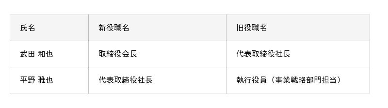 武田が将来の成長基盤を、平野が既存事業の収益力強化を担う強力な二軸体制へと移行することで、両輪を加速させます。 当社はこの新体制のもと変化の激しい市場環境に迅速に対応し、さらなる企業価値の向上と持続的な事業成長の実現を目指します。代表取締役異動の内容(2025年12月22日付)