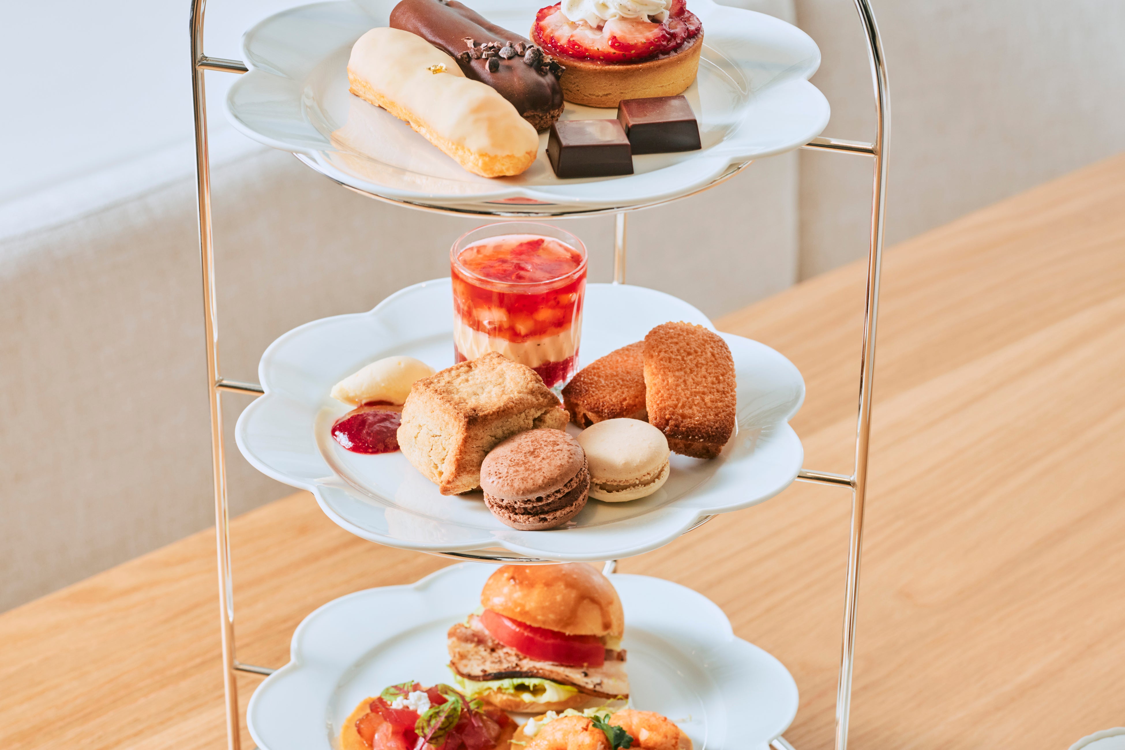 セイボリーには、旅するメゾンで出会った野菜・ハーブ・肉・魚介を使ったクロワッサンサンドやタコスを。スイーツには、エクレア、マカロン、フィナンシェ、ヴェリーヌなどブランドの人気スイーツを少しずつ。季節ごとに表情を変える旬の素材が、ショコラとともに調和します。