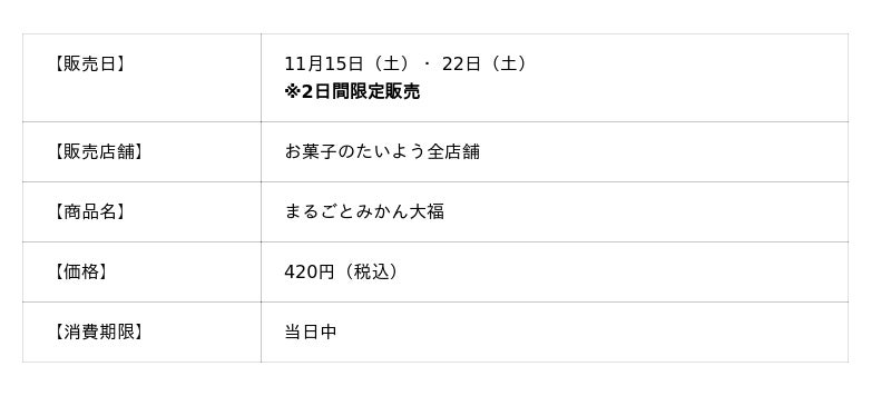 株式会社太陽社(所在地:千葉県匝瑳市飯倉293、代表取締役:片岡正裕)が展開する、千葉県で長年愛され続ける菓子店「お菓子のたいよう」では、毎年完売・予約殺到する初冬の看板商品『まるごとみかん大福』を、11月15日(土)と11月22日(土)の2日間限定で販売いたします。