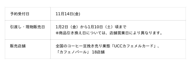 COFFEE STYLE UCC株式会社(本社/兵庫県神戸市、代表取締役/西本圭吾、以下CSU)は、UCCグループ直営のコーヒー豆挽き売り業態「UCCカフェメルカード」「カフェノバール」18店舗にて、5種類の『珈琲福袋2026』の店頭予約受付を、11月14日(金)に開始します。