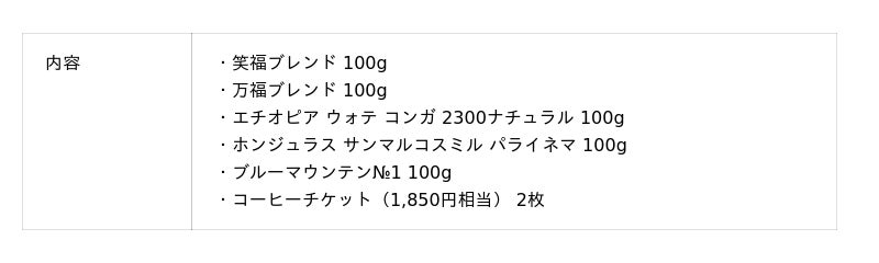 福袋限定ブレンド2種とブルーマウンテンNo.1ブレンド、フルーティなおいしさで人気のモカベレテゲラが入ったセットです。