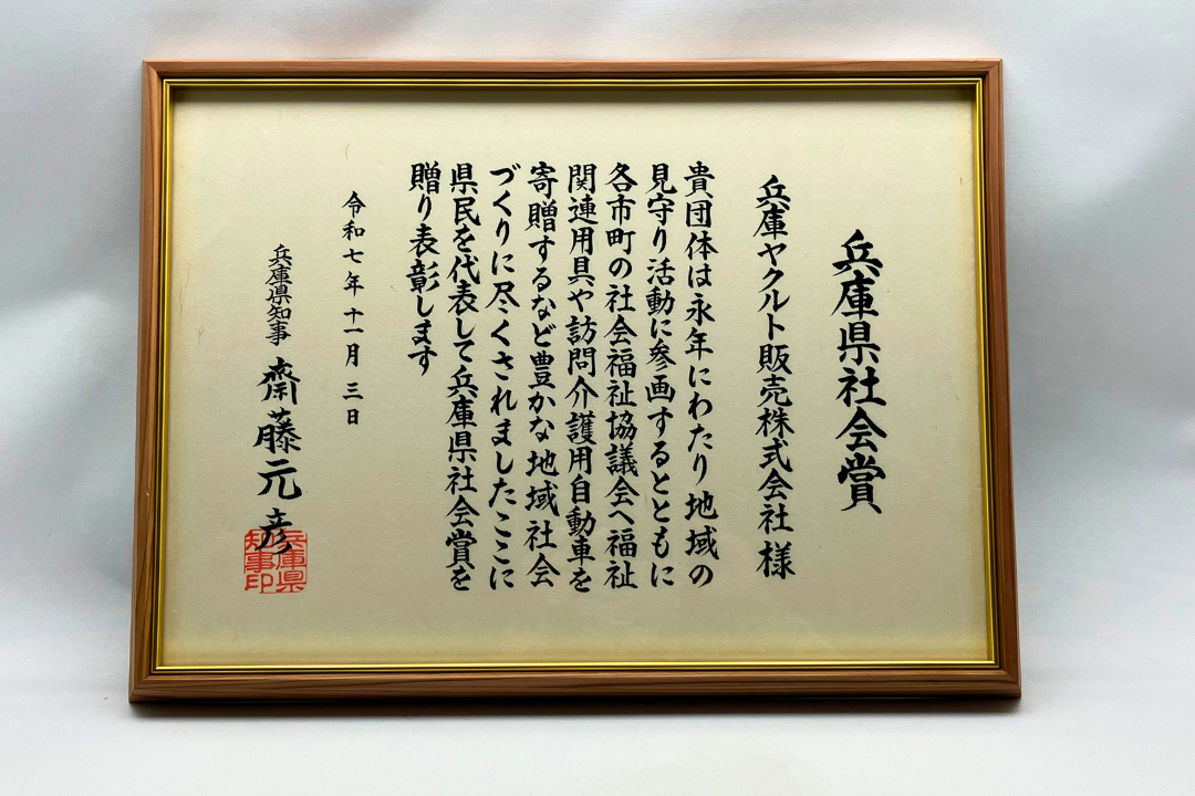 兵庫ヤクルト販売株式会社(以下、兵庫ヤクルト)は、この度兵庫県より「令和7年度 兵庫県社会賞」を受賞いたしました。本賞は、社会奉仕活動や文化活動などを通じて、明るく豊かな地域社会または職域づくりに貢献した個人や団体を表彰するものです。当社が長年にわたり実施してきた「福祉ヤクルト」における福祉関連用具や訪問介護用自動車の寄贈が、県内の社会福祉のさらなる発展に継続的に貢献していると高くご評価いただき、受賞の運びとなりました。