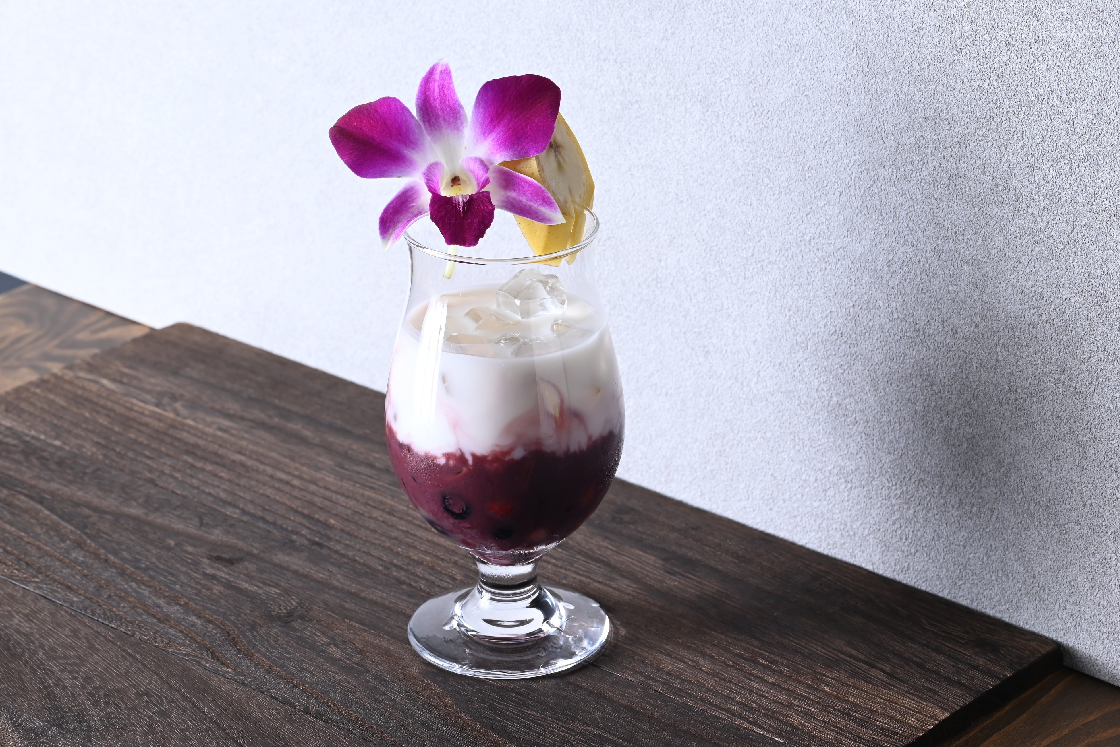 【メニュー説明】アサイーのピューレに、濃厚なバナナシロップを加え、飲むヨーグルトで2層仕立て。濃厚で満足度の高いデザートカクテルです。