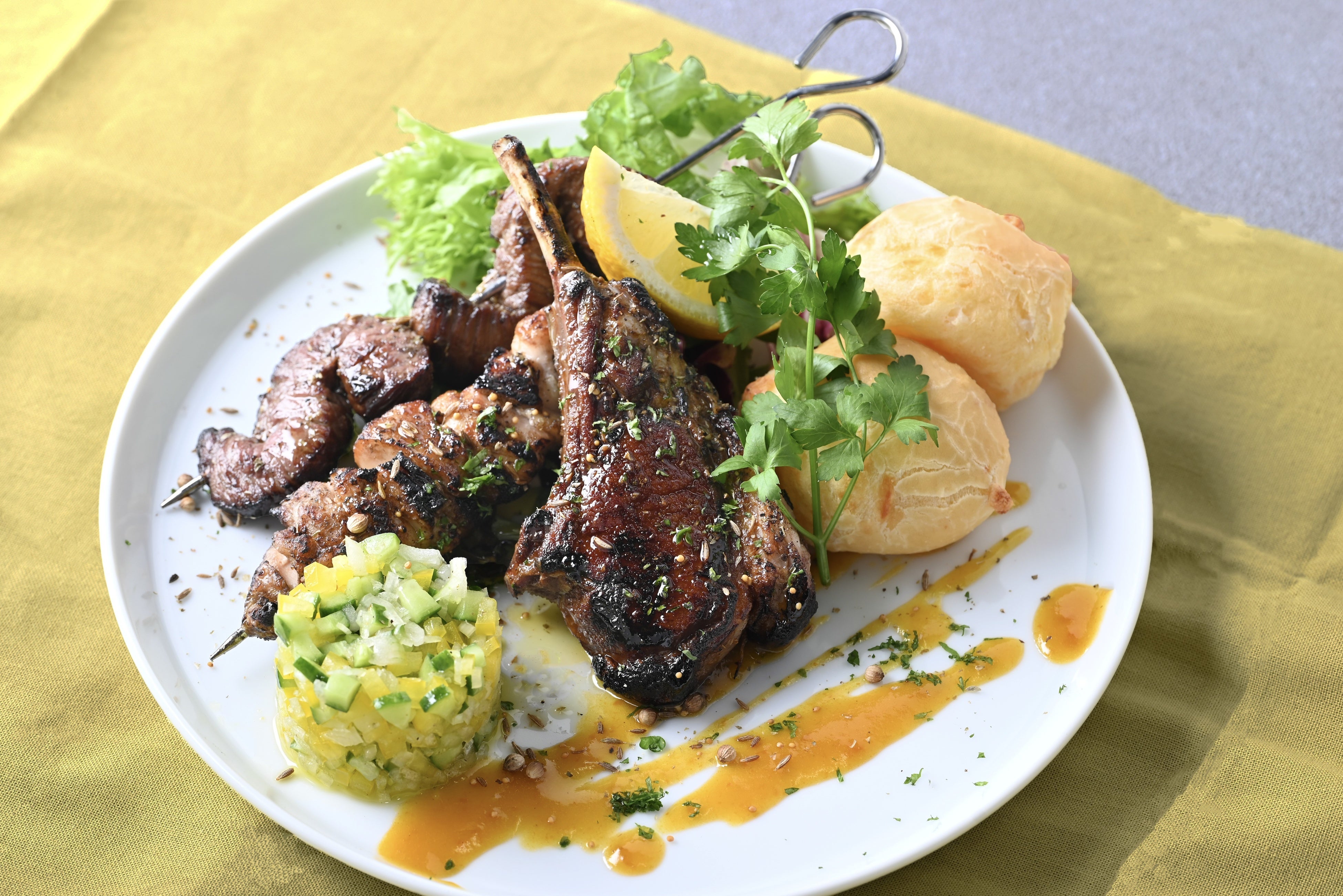 カナリヤカラーのマラクジャ(パッションフルーツ)を使用したオリジナルソースとブラジルカラーのエスペチーニョ(サルサ)と、2種のソースで楽しみお肉のプレートにポンデケージョを盛り合わせ、ブラジリアンを演出。