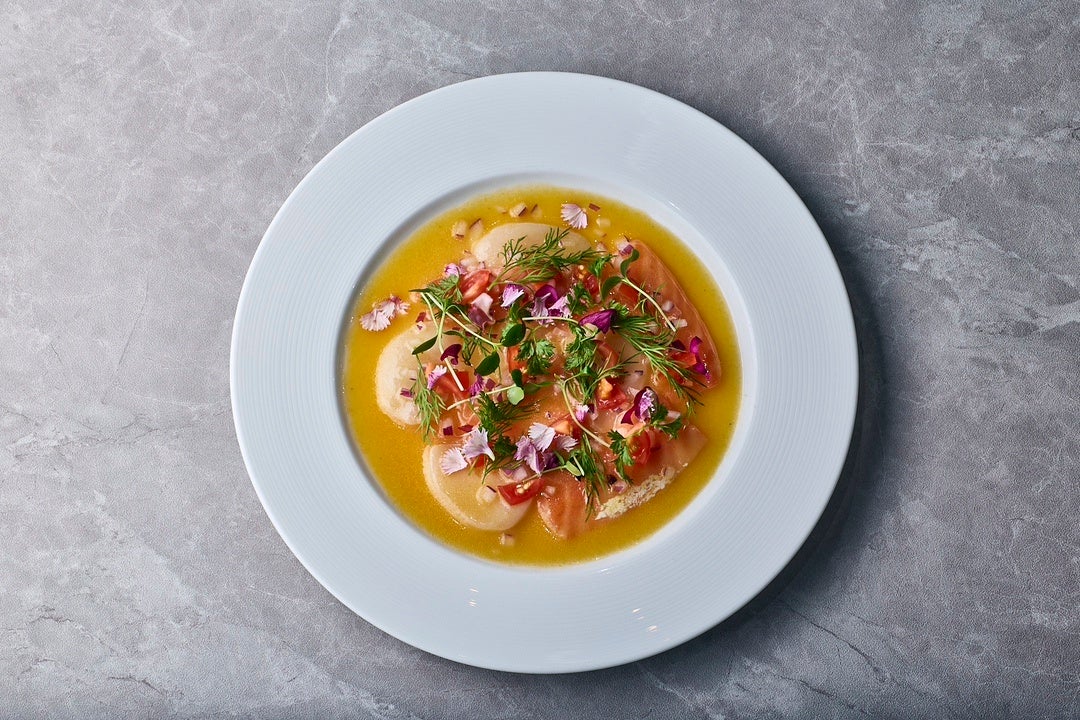 【メニュー説明】サーモンの良質な脂と平貝の甘味ののった味わいと食感を目が覚めるようなキレのある酸味と鼻に抜けるトロピカルな香りのドレッシングで楽しむひと品。