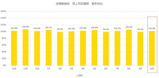 10月度売上は前年対比102.0%と前月から2.8pt増加した