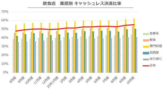 キャッシュレス決済比率は9月度から10月度にかけて、すべての業態で増加した