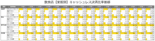 - 集計3:飲食店 ジャンル別 キャッシュレス決済方法比率、キャッシュレス決済比率