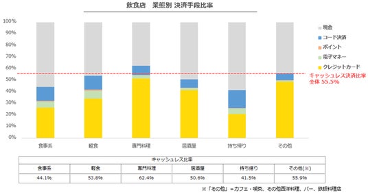 - 業態別にキャッシュレス比率を見ると、すべての業態で40%を超える。またコード決済比率が一番高い「持ち帰り」では、その割合が15.6%であった。