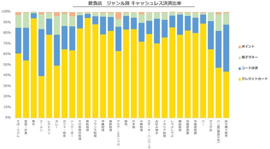 - ジャンル別に見ると、28ジャンル中20ジャンルでキャッシュレス比率が50%を超える。コード決済比率では、13ジャンルが10%を超える。その中でもサラダ店では、その比率が19.0%と一番高い。