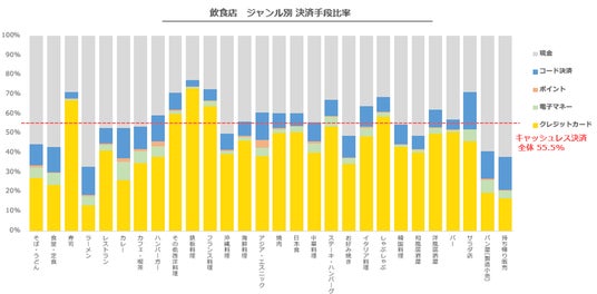 集計内容:飲食店 ジャンル別 キャッシュレス決済方法比率、キャッシュレス決済比率(内訳)
