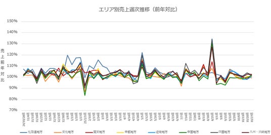 - 10月売上における、前年対比の伸長率(地方平均)は100.6%と前月から0.6pt増加した。各地域の売上伸長率は、北海道地方と四国地方が1位タイで前年対比102.0%となった。
