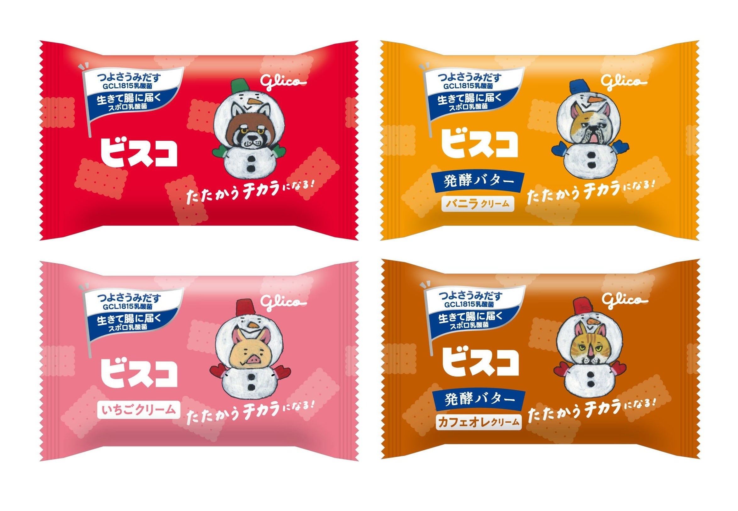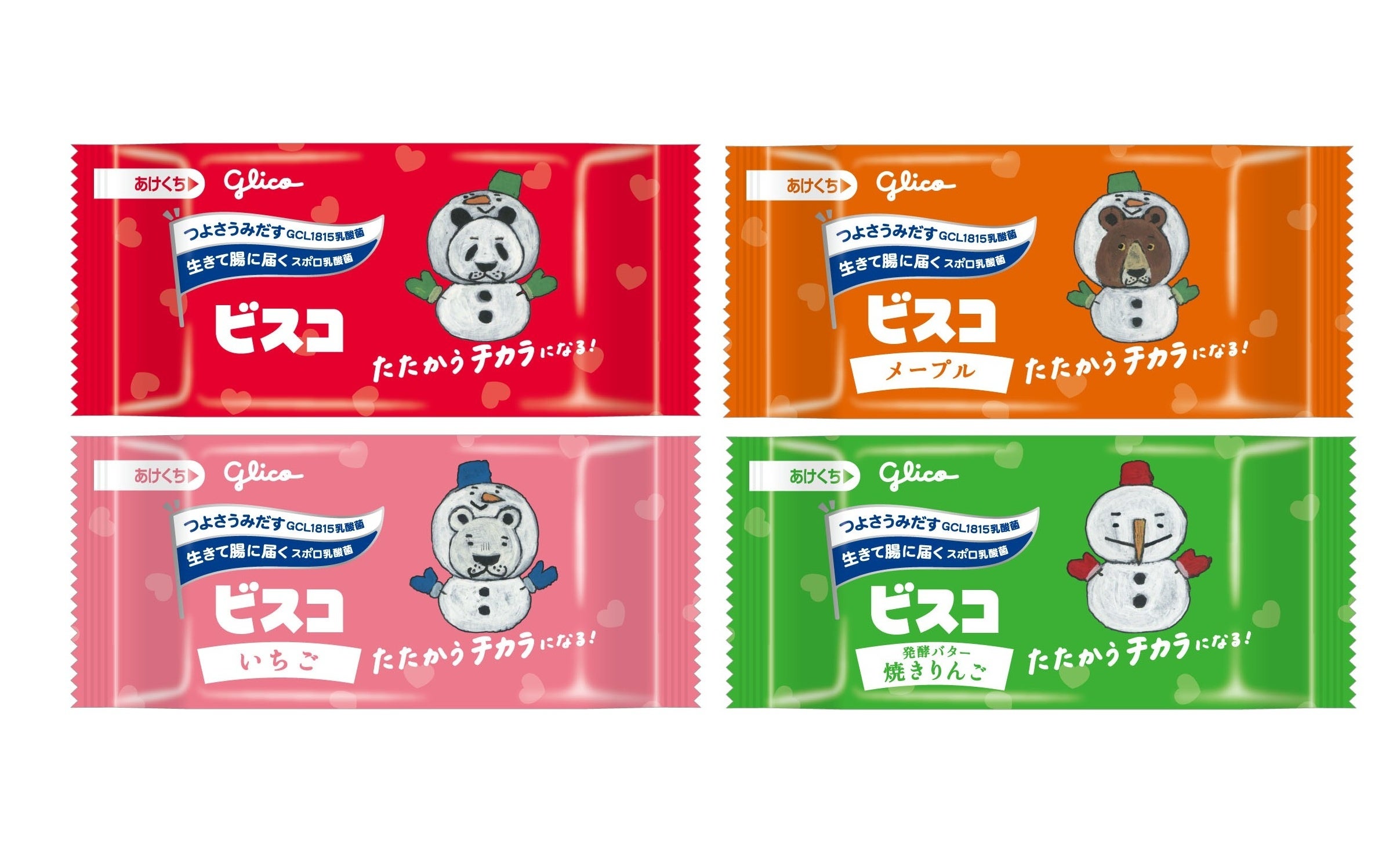 今年で発売から 92 周年を迎えた「ビスコ」は、シンバイオティクス※2 の考えに基づき、これまで「生きて腸に届くスポロ乳酸菌」と「食物繊維」を配合していましたが、今年4月に当社が保有する約 1 万種の菌株の中から独自研究によって選び抜いた、「つよさうみだす GCL1815 乳酸菌」を、新たに加えるリニューアルを実施しました。2つの乳酸菌が入った「ビスコ」を楽しくお届けすべく、昨年実施し、好評をいただいたゆきだるまのクリームの「ビスコ」を今年も発売します。