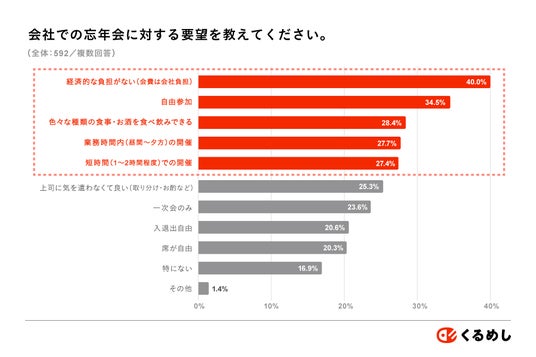 同調査において、会社での忘年会に対する要望を聞くと、「自由参加」34.5%、「業務時間内(昼間~夕方)の開催」27.7%、「短時間(1~2時間程度)での開催」27.4%など、“参加しやすさ”を求める声が上位に。「会費の会社負担」40.0%を望む声も多く、金銭・時間両面での配慮が求められています。
