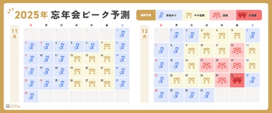 当社では12月26日に忘年会のピークを迎えるという予測を立てています。12月は金曜日や3週目にも混雑の兆しが見えており、11月下旬~12月上旬の少し早めの時期にランチタイムや終業1時間前など、就業時間内での忘年会開催をおすすめしています。