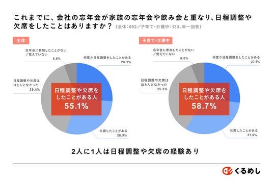 当社が2025年10月に実施した『会社の忘年会に関する調査(2025)』※1によると、「共働き」は49.7%と約半数にのぼり、「子育て・介護をしている」人は25%と、4人に1人が仕事と家庭を両立している実態が明らかになりました。そのように従業員の働き方や生活スタイルが多様化している中、半数以上が家庭内で忘年会の日程がバッティングし日程調整や欠席を余儀なくされた経験があると回答しており、従業員が心おきなく忘年会に参加できるためには主催者側の工夫も求められそうです。