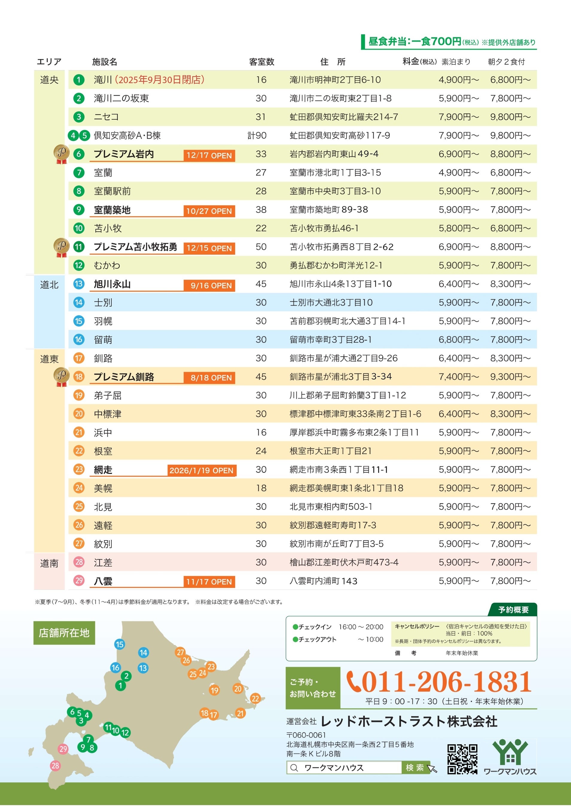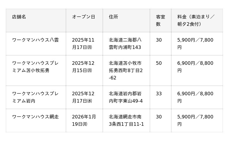 北海道を中心に工事事業者支援事業などを展開するレッドホーストラスト株式会社(本社:北海道札幌市中央区、代表取締役:八重樫 暁)は、北海道の八雲町・岩内町・苫小牧市・網走市に、出張に特化した食事付きビジネス宿泊施設「ワークマンハウス」を4店舗新規オープンいたします。既存24店舗に加え、道内での展開は合計28店舗となる予定です。
