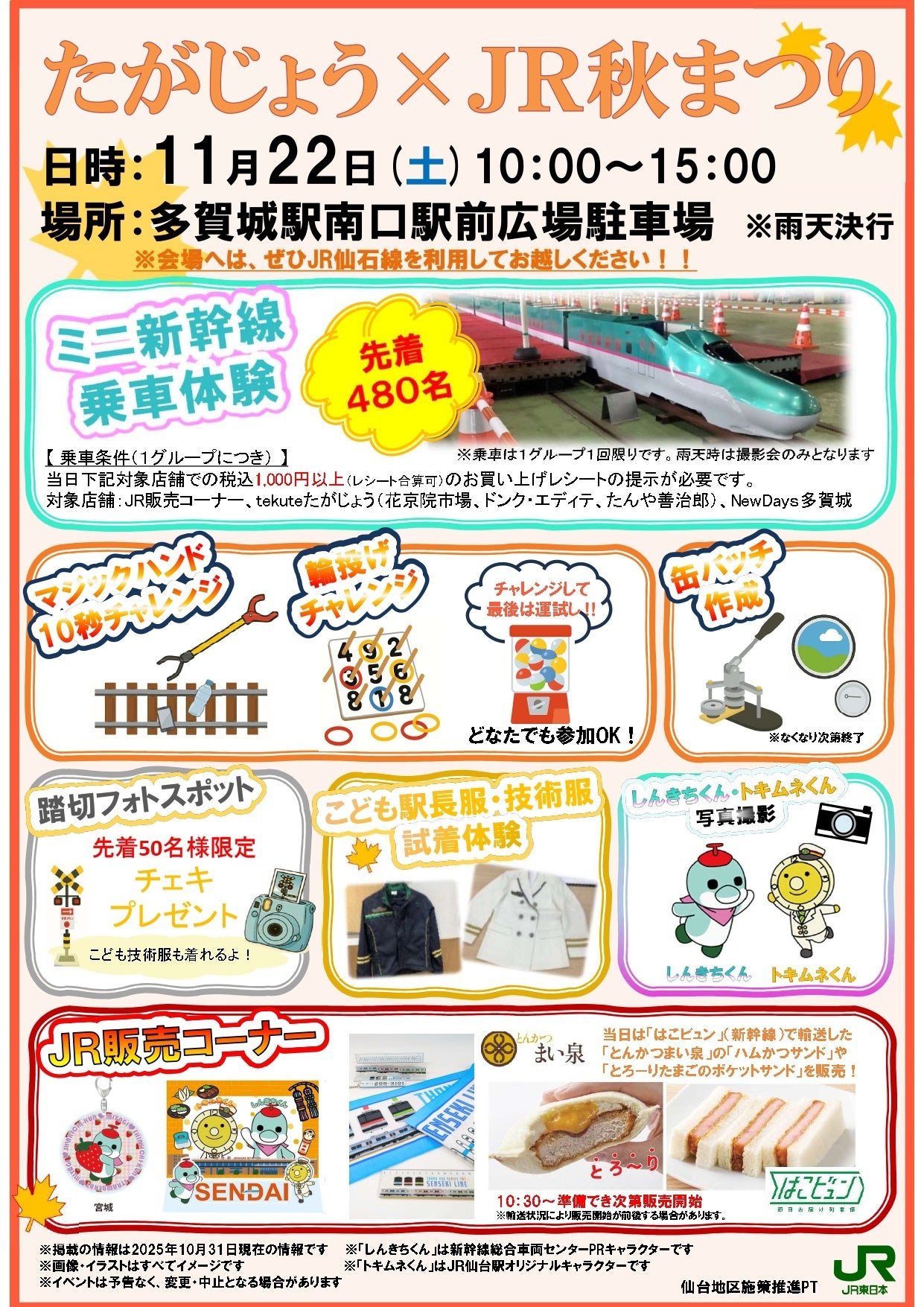 715系アクリルスタンド・アクリルキーホルダーは、2025年11月22日(土)に開催される多賀城駅南口駅前広場駐車場で開催の「たがじょう×JR秋まつり」にて店頭販売も実施します。ぜひ東北MONO WEB SHOPブースにお立ち寄りいただき、商品をお手に取ってご覧ください。